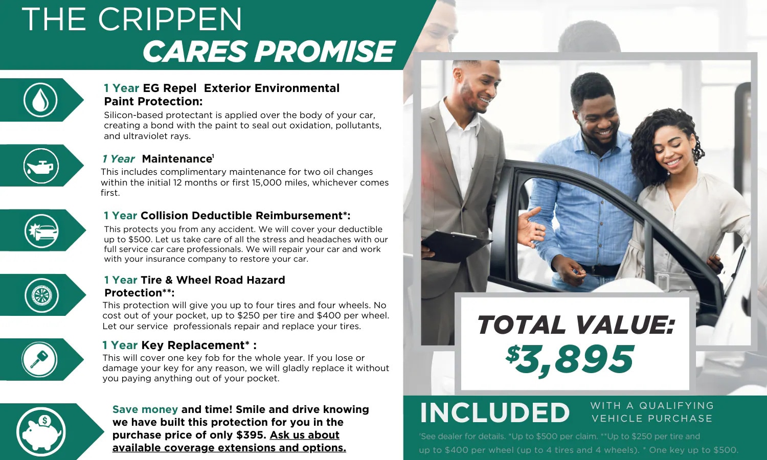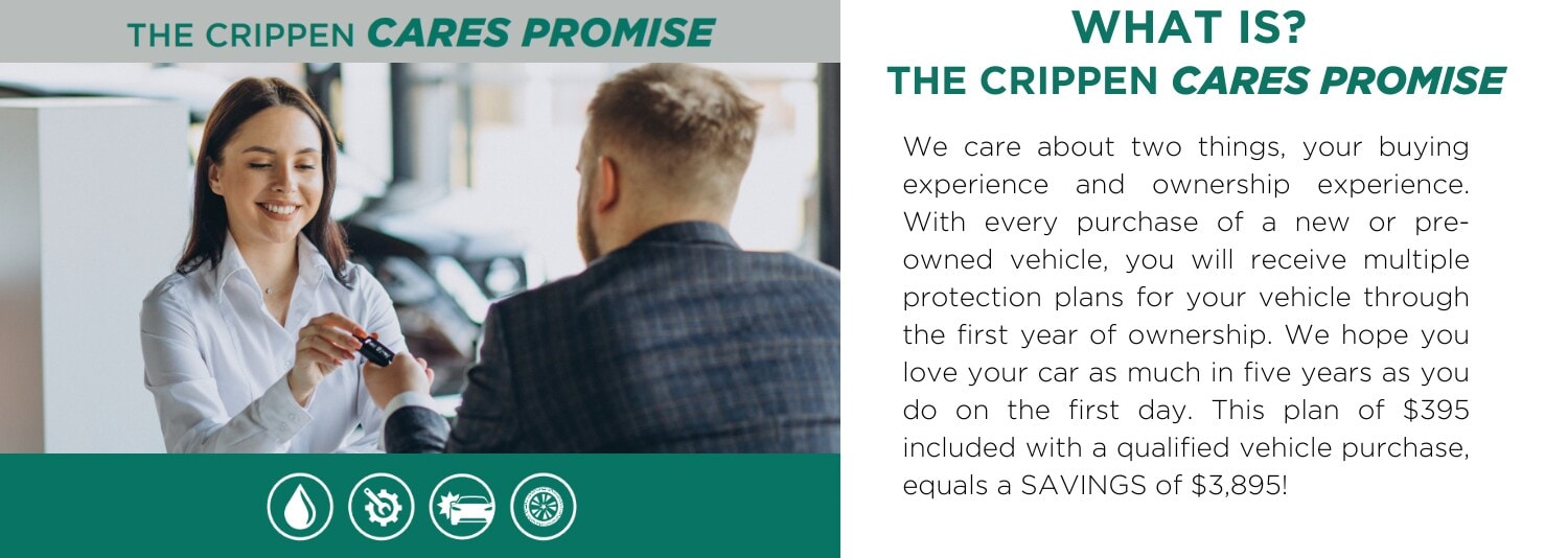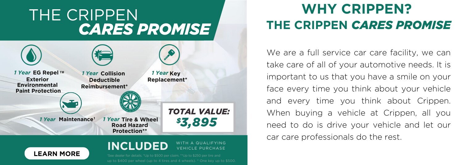 In all, our Crippen Cares Promise covers up to $3,895 of expenses associated with your vehicle. From exterior protection to maintenance and reimbursements, we have your back long after you've purchased from us. How's that for a promise?